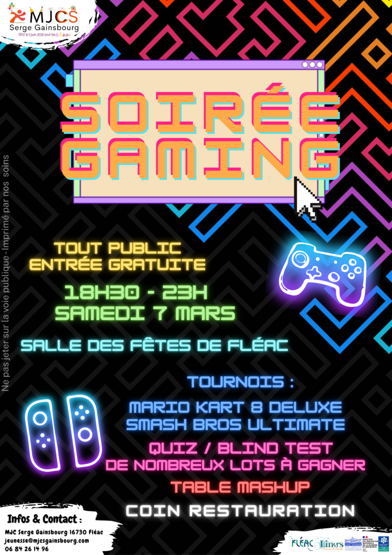 Au programme : tournois de jeux vidéo, jeux de société, quiz, blind test, et plein de lots à gagner ! Ils comptent sur votre présence pour partager un moment fun et plein d’énergie en famille. Buvette et restauration sur place !