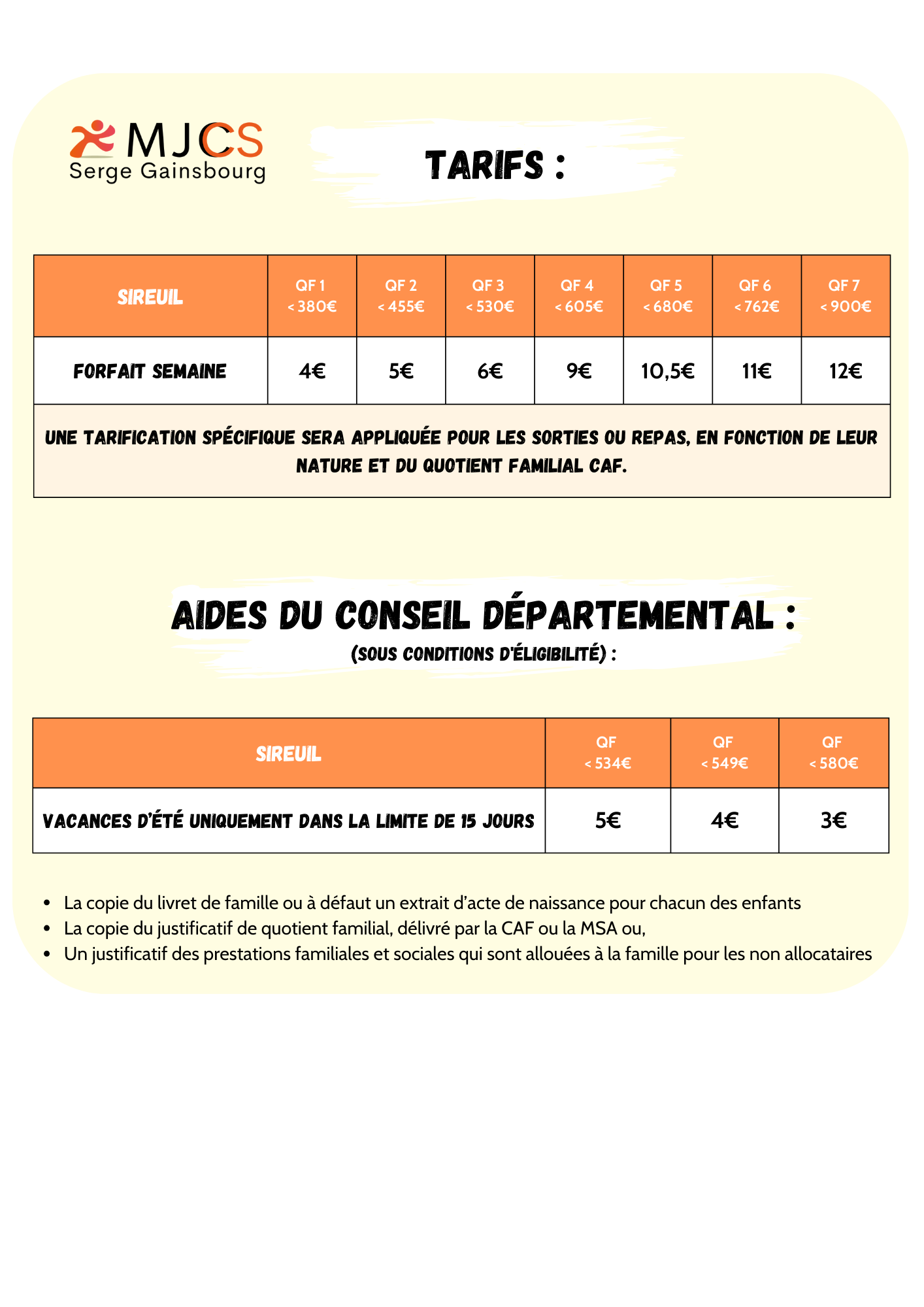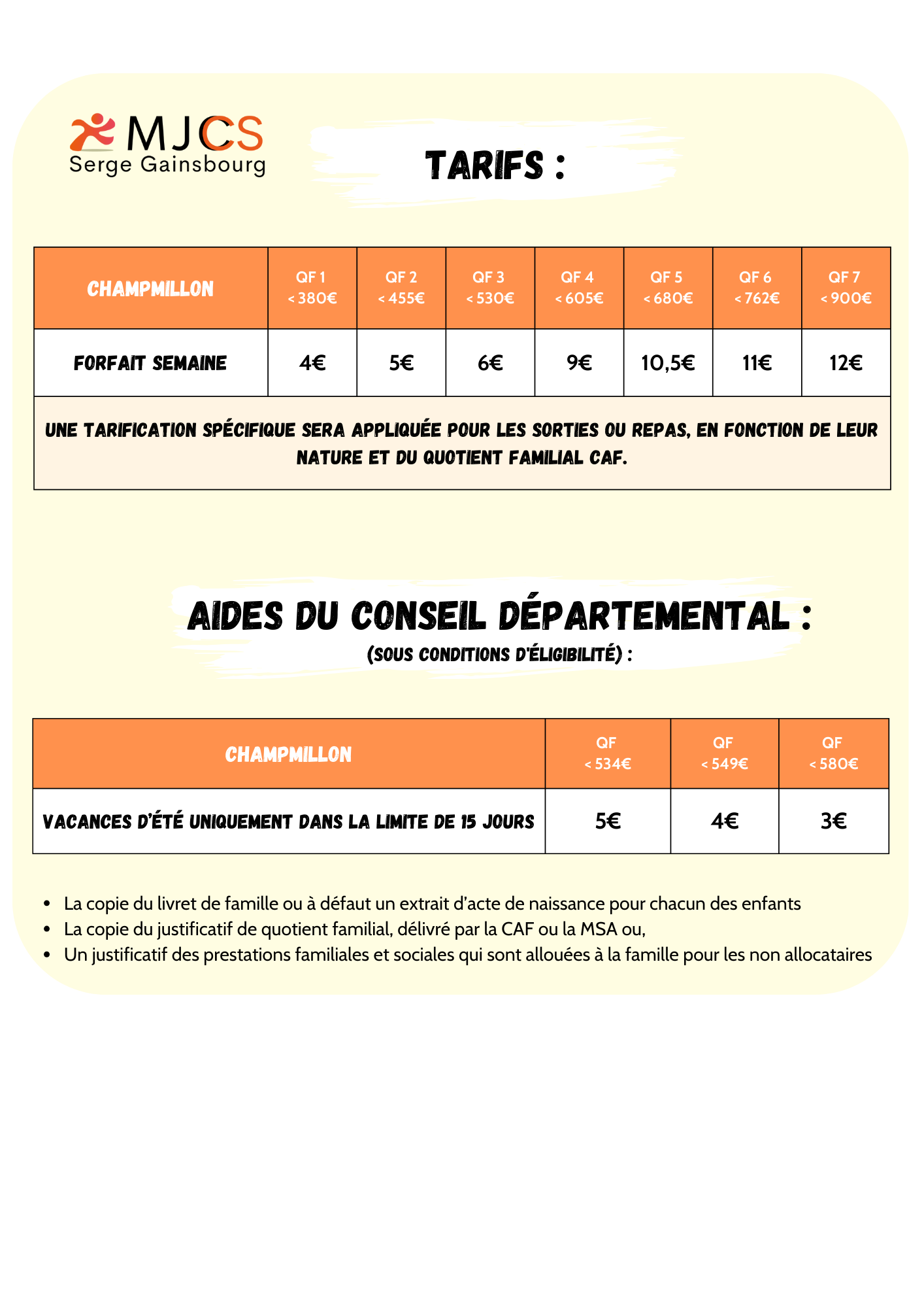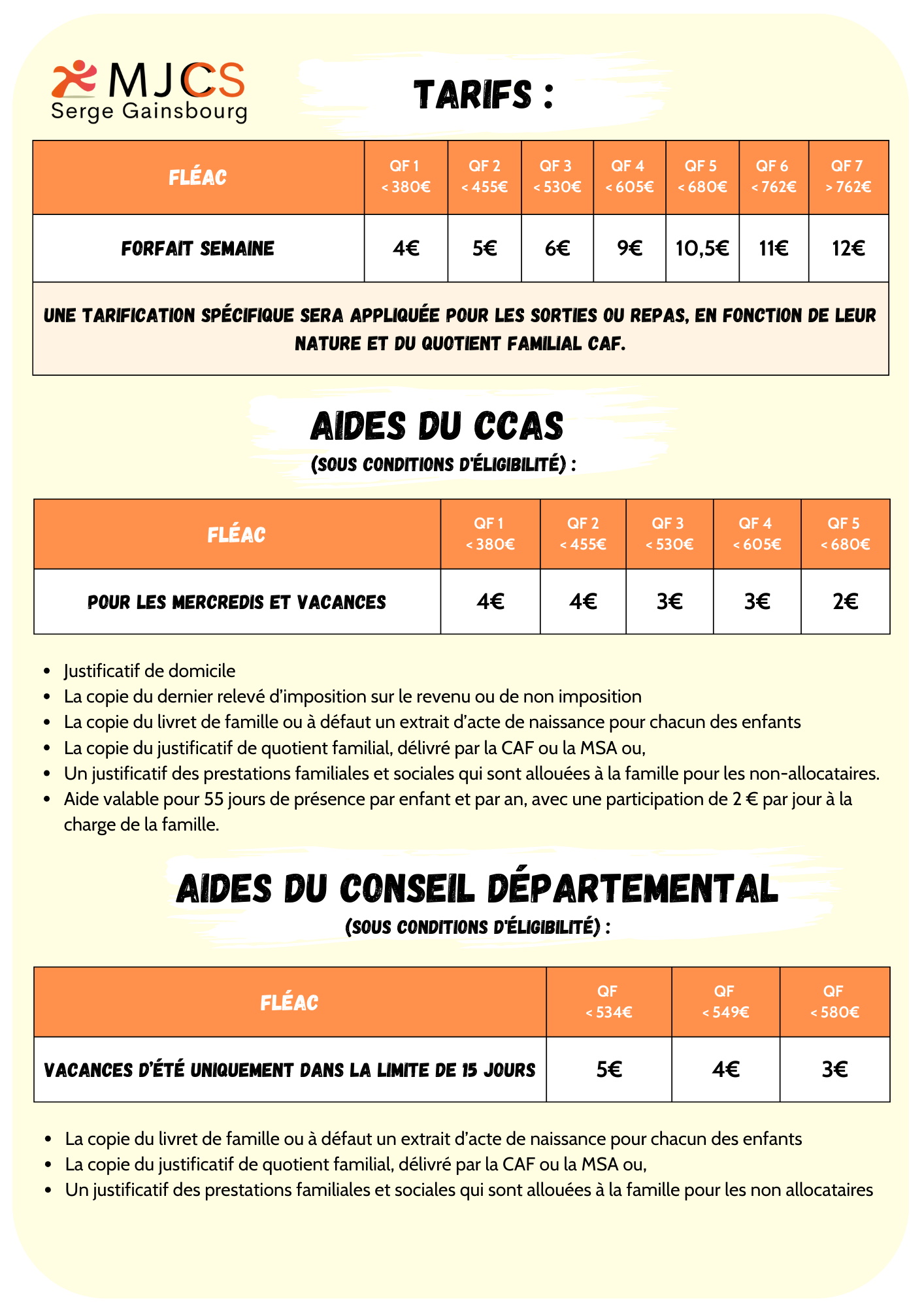Les tarifs sont déterminés en fonction des soutiens financiers accordés par votre commune et sont également basés sur votre quotient familial. Vous pourriez être éligible aux aides du CCAS ou du Conseil Départemental. N’hésitez pas à vous renseigner à ce sujet.